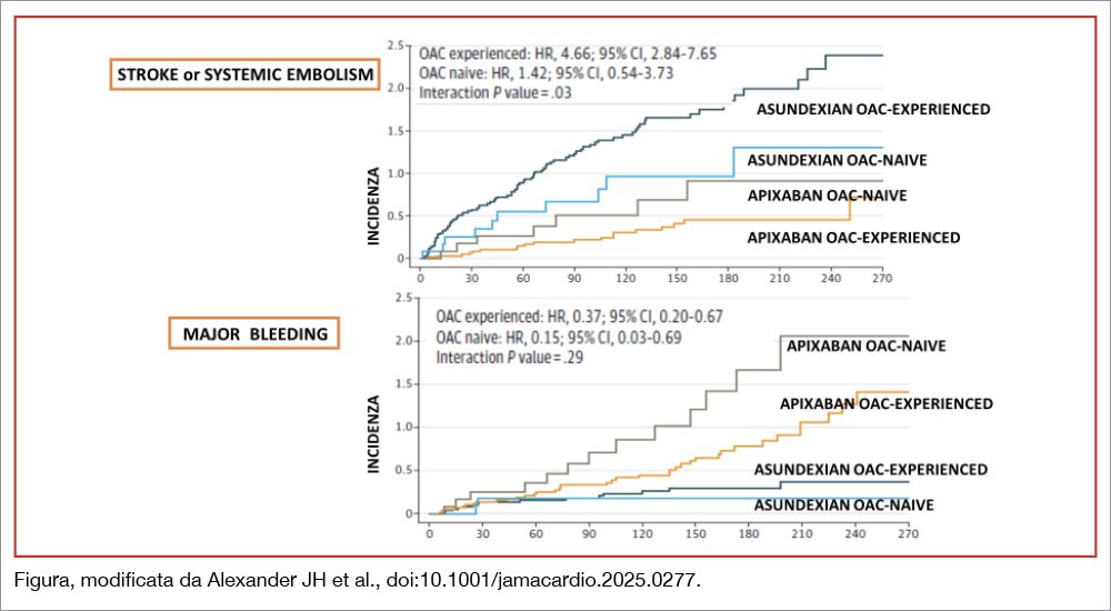 Asundexian, un inibitore del fattore XIa, è risultato meno efficace di apixaban nel ridurre gli eventi tromboembolici nello studio OCEANIC AF[1]Piccini JP, Caso V, Connolly SJ, et al. PACIFIC-AF Investigators. Safety of the oral factor XIa inhibitor asundexian compared with apixaban in patients with atrial fibrillation (PACIFIC-AF): a … Continua a leggere. È noto che gli anticoagulanti orali diretti (DOACs) sono più efficaci nel ridurre gli eventi trombotici rispetto a warfarin se i pazienti sono anticoagulanti-naive (“OACnaive”), cioè non sono mai stati trattati in precedenza con tali farmaci[2]Garcia DA, Lopes RD, Hylek EM. New-onset atrial fibrillation and warfarin initiation: high risk periods and implications for new antithrombotic drugs. Thromb Haemost. 2010;104:1099-1105. … Continua a leggere. Lo scopo di questa analisi pre-specificata è di verificare, nello studio OCEANIC AF (condotto in 1.035 sedi in 38 Paesi), come i DOACs si confrontino con asundexian a seconda del trattamento precedente o meno con anticoagulanti. I pazienti in fibrillazione atriale (AF) sono stati suddivisi in “OAC-naive” o “OAC-experienced” a seconda che, alla randomizzazione, fossero già in trattamento da meno di 6 settimane o da più di 6 settimane con un OAC. I gruppi erano così costituiti: 2.493 (17%) “OAC-naive” (età media 72.6 anni) di cui 1.238 con asundexian e 1.255 con apixaban; 12.317 (83%) “OACexperienced” (età media 74.2 anni), di cui 6.177 con asundexian e 6.140 con apixaban. Come mostra la Figura (pannello in alto), tra i pazienti “OAC-naive”, l’incidenza di stroke-embolismo sistemico è stata dello 0.8% con asundexian versus 0.6% con apixaban (hazard ratio [HR], 1.42; 95%CI, 0.54-3.73), mentre è stata più ampia la differenza a svantaggio di asundexian nei pazienti “OAC-experienced” (asundexian 1.4% versus apixaban 0.3% (HR, 4.66; 95% CI, 2.84-7.65; P for interaction =.03). Il bleeding maggiore (Figura, pannello in basso) è stato significativamente inferiore con asundexian sia nei pazienti “OAC-experienced” (0.2% versus 0.7%, HR, 0.37; 95% CI, 0.20-0.67) che nei pazienti “OAC-naive” (0.2% versus 1%, HR, 0.15; 95% CI, 0.03-0.69, Interaction P value =.29). In conclusione, questa analisi pre-specificata dello studio OCEANIC-AF mostra che il beneficio osservato con apixaban nel ridurre gli eventi trombo-embolici rispetto ad asundexian si manifesta prevalentemente nei pazienti “OAC-experienced”, mentre la riduzione del bleeding maggiore è osservata con asundexian indipendentemente dal trattamento precedente o meno con OAC. La causa di questo differente comportamento osservato nella popolazione studiata in OCEANIC-AF non è noto e merita di essere approfondito.