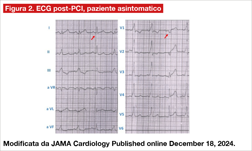 Trattasi di un tracciato ischemico con presenza del segno di De Winter(1) in un paziente con sindrome di pre-eccitazione ventricolare di tipo A. La pre-eccitazione è rivelata da onde delta. Il sottoslivellamento di ST può inizialmente far pensare a una sindrome coronarica acuta non-ST elevation (NSTE-ACS), per il sottoslivellamento di ST presente nelle derivazioni precordiali, ma il tratto ST è concavo, non discendente ed è seguito da onde T positive e appuntite, chiaramente indicando il pattern segnalato da De Winter e coll.[1]de Winter RJ, Verouden NJ,Wellens HJ, Wilde AA; Interventional Cardiology Group of the Academic Medical Center. A new ECG sign of proximal LAD occlusion. N Engl J Med. 2008;359:2071-2073. … Continua a leggere, rappresentativo di occlusione acuta dell’arteria discendente anteriore (osservato nell’1-2% dei casi). Il riconoscimento di questo segno elettrocardiografico è molto importante, perchè è equivalente a un sopraslivellamento di ST e perciò indica la necessità di una coronarografia urgente e di una rivascolarizzazione immediata. Il suo mancato riconoscimento può ritardare l’accertamento angiografico ed esporre il paziente a un rischio elevato. La coronarografia ha in effetti mostrato un’occlusione prossimale dell’arteria discendente anteriore, trattata con successo con una PCI primaria con stenting del vaso riperfuso. Interessante la sequenza elettrocardiografica successiva che ha mostrato la scomparsa dei segni De Winter e assenza di onde Q nelle derivazioni precordiali. Tuttavia, il terzo battito non mostra la pre-eccitazione (vedi Figura 2, freccia). In questa sequenza sono individuabili onde Q in V1 e V2 con ST sopraslivellato fino a V5 (non registrata la V6), assenti nelle sequenze dove la pre-eccitazione è presente, in quanto l’onda delta positiva maschera la presenza dell’onda di necrosi. Il paziente ha avuto una buona evoluzione clinica con un picco di troponina di 4.570 pg/mL (reference 28 pg/mL).