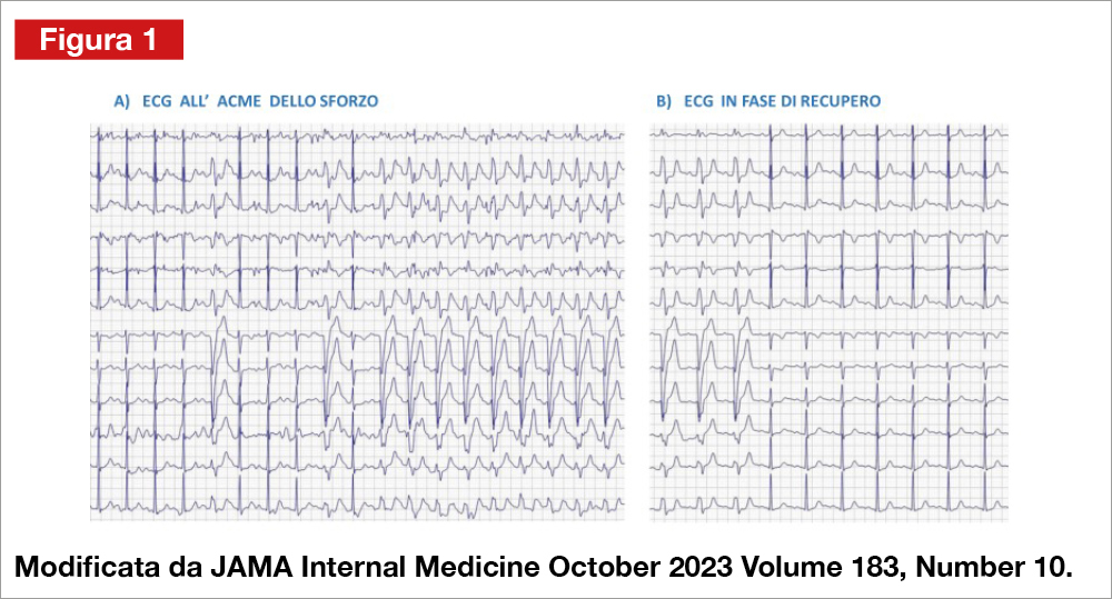 Un paziente sulla sessantina lamenta da circa due settimane dolore toracico durante attività fisica. Il test ergometrico riproduce il sintomo e viene interrotto al secondo stadio del protocollo di Bruce. Il blocco di branca sinistra (BBS) compare durante il test a una frequenza cardiaca di 107 bpm in coincidenza con l’angor e nel recupero scompare, contemporaneamente alla cessazione del dolore toracico riducendosi la frequenza (vedi Figura 1, pannelli A e B). Un caso simile è stato presentato in un precedente numero di Omaggio all’elettrocardiografia di Journal Map. Qui, tuttavia, il contesto clinico è differente.