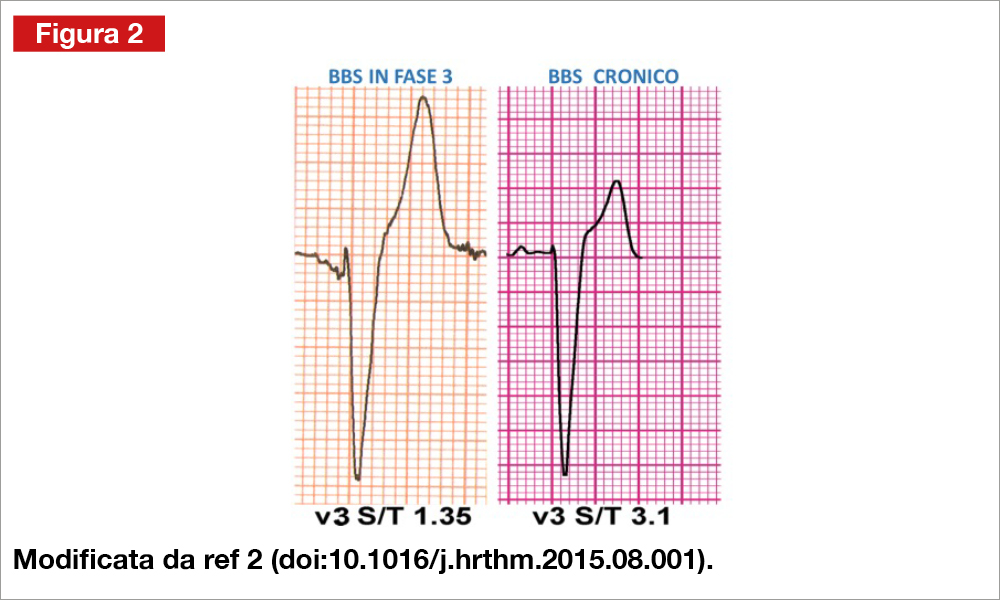 La prima osservazione, valutando il tracciato sia prima dell’insorgenza di BBS (e del sintomo anginoso) che alla scomparsa dell’alterazione della conduzione, consiste nell’assenza di alterazioni della ripolarizzazione suggestive di ischemia miocardica (sottoslivellamento di ST, presenza di onde T negative). Inoltre, il paziente è stato sottoposto a TC coronarica che ha mostrato un albero indenne da lesioni ostruttive. La diagnosi finale è stata quella di sindrome dolorosa da blocco di branca sinistra. Il paziente è stato posto in terapia con bisoprololo 5 mg/die. Il BBS nel paziente è “tachicardia-dipendente” (o “in fase 3”) in quanto lo stimolo raggiunge il sistema di conduzione in fase refrattaria per una incompleta ripolarizzazione. Tale fenomeno è stato segnalato nello 0.38% dei pazienti sottoposti a test ergometrico. La prima osservazione risale al 1976[1]Vieweg WV, Stanton KC, Alpert JS, Hagan AD. Rate-dependent left bundle-branch block with angina pectoris and normal coronary arteriograms. Chest. 1976;69:123-124. doi:10.1378/chest.69.1.123. e la sua definizione come entità clinica fu stabilita da Shvilkin e coll., che riportarono 50 casi di “painful LBBB syndrome”(2). A questi Autori si deve, inoltre, l’acuta osservazione che in questi casi il rapporto onda S/onda T dei complessi BBS nelle derivazioni precordiali è <1.8, mentre eccede questo numero quando il BBS è cronico (Figura 2). In più, l’asse di RS è rivolto verso il basso nel BBS in fase 3, mentre è deviato a sinistra nel BBS cronico. Il dolore toracico sarebbe causato da uno specifico pattern di attivazione ventricolare parietale associato alla dissincronia di contrazione ventricolare durante le fasi di BBS; infatti, se si modifica il pattern di attivazione (ad esempio eseguendo un pacing dall’apice del ventricolo destro) il sintomo scompare[2]Shvilkin A, Ellis ER, Gervino EV, Litvak AD, Buxton AE, Josephson ME. Painful left bundle-branch block syndrome: clinical and electrocardiographic features and further directions for evaluation and … Continua a leggere. La maggior parte dei pazienti rispondono favorevolmente alla terapia con betabloccante e la prognosi a distanza è buona.