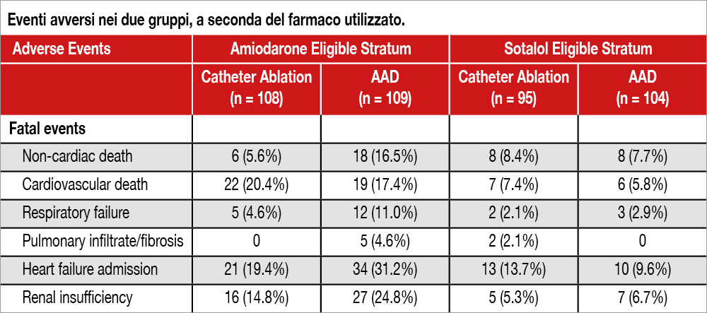 Sono stati inclusi nello studio 416 pazienti, di cui 199 nello strato sotalolo e 217 in quello amiodarone. Condizioni per l’inclusione erano una storia di infarto miocardico, l’impianto di ICD e almeno un episodio di VT sostenuta monomorfa non in trattamento farmacologico trattata dal dispositivo nei 6 mesi precedenti. Il sotalolo veniva somministrato alla dose di 120 mg due volte al dì, mentre l’amiodarone era iniziato a un dosaggio di 400 mg due volte al dì per 2 settimane, 400 mg/die per 4 settimane e mantenuto a 200 mg al dì. L’ablazione veniva eseguita entra 14 giorni dalla randomizzazione. Vi erano differenze tra i due strati: in quello trattato con amiodarone (108 pazienti randomizzati vs 109 con ablazione) erano più frequenti gli esiti di bypass aortocoronarico (49% vs 36%) la classe NYHA III (15% vs 0%), la fibrillazione atriale (41% vs 26%) che nei 95 pazienti trattati con sotalolo (randomizzati vs 105 trattati con ablazione) mentre la FE era 32% nei pazienti trattati con amiodarone vs 36% nei trattati con sotalolo. La mediana di follow-up è stata di 4.3 anni. L’endpoint primario (composito di morte per ogni causa, shock appropriato dell’ICD, storm di VT oppure VT sostenuta al di sotto della soglia di individuazione del dispositivo >14 giorni dopo la randomizzazione) nello strato sotalolo è stato riscontrato nel 46% dei pazienti ablati versus il 59% dei pazienti in trattamento farmacologico (HR 0.64; 95% CI 0.43–0.94; P=0.02), mentre nello strato amiodarone si verificava un endpoint primario nel 55% dei pazienti assegnati ad ablazione vs il 61% dei pazienti in terapia farmacologica (HR 0.86; 95% CI 0.61–1.22, P=NS). Nello strato sotalolo, risultavano più frequenti episodi VT sotto la soglia di individuazione dell’ICD con il farmaco (17.3%) che con l’ablazione (2,1%, HR 0.12; 95% CI 0.03-0.5; P=0.004); nello strato amiodarone esse venivano riscontrate nel 6.5% dei pazienti ablati e nel 15.6% dei trattati con il farmaco (HR 0.41; 95% CI 0.17-0.99; P=0.048) Come mostra la Tabella, gli eventi avversi erano molto più frequenti con l’amiodarone che con l’ablazione, soprattutto la mortalità non da causa cardiaca, l’insufficienza respiratoria e i ricoveri per scompenso.