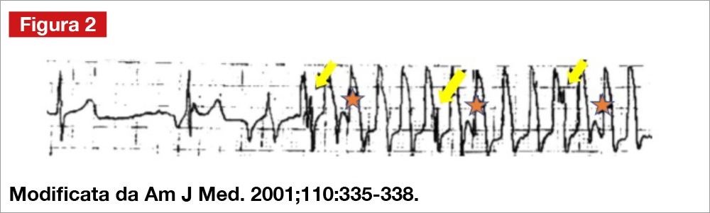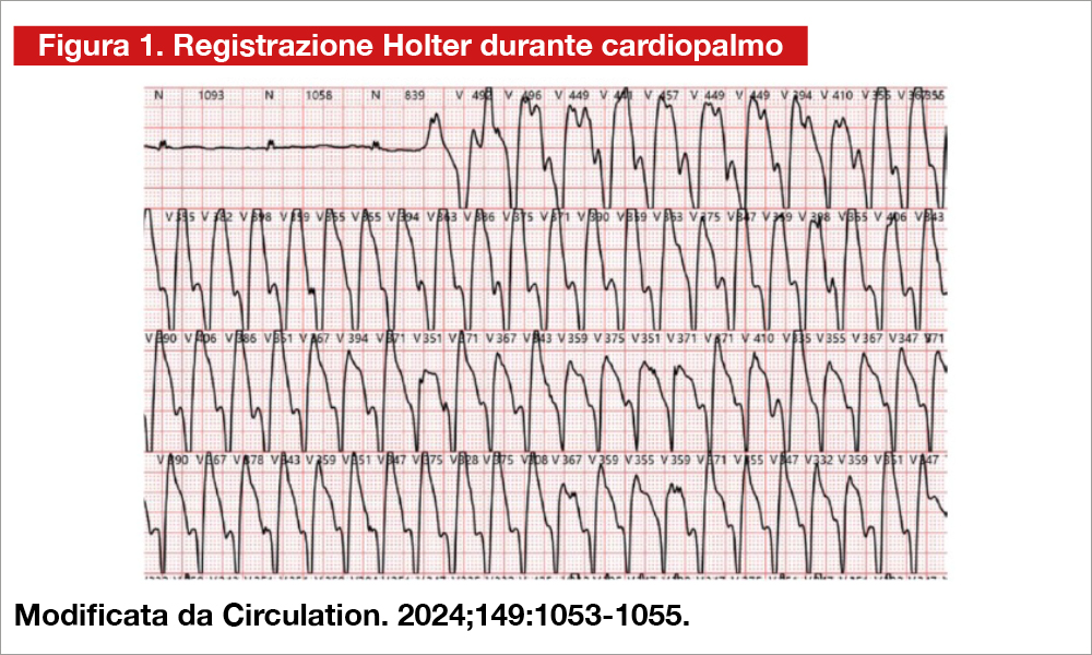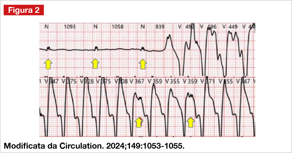 Una donna di 55 anni, ipertesa, diabetica, affetta da cardiomiopatia ipertrofica, portatrice di defibrillatore impiantabile in prevenzione primaria, si presenta al Pronto Soccorso per episodi di cardiopalmo associato a dispnea. Riferisce che il defibrillatore è intervenuto molte volte nelle ultime ore; ha eseguito un ECG Holter che ha registrato il tracciato evidenziato in Figura 1 e che è stato interpretato come tachicardia ventricolare.