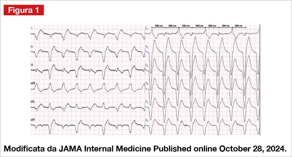 Un paziente sulla sessantina si presenta al PS per costrizione toracica e dispnea 1 settimana dopo la seconda dose di toripalimab, un inibitore del checkpoint immunitario, assunto al dosaggio bisettimanale di 240 mg per un cancro prostatico metastatico. All’ingresso la pressione è 145/82 mm Hg, la frequenza cardiaca 105 bpm con una saturazione di O2 di 95% in aria ambiente. L’ecocardiogramma mostra una moderata disfunzione sistolica del ventricolo sinistro (FE 44%). Risulta alto il valore di troponina I (1.376 pg/mL, reference, <19.8 pg/mL), nella norma invece il valore di NTproBNP (87 pg/mL, reference, <125 pg/mL) e la potassiemia (4.81 mEq/L). Un ECG eseguito un mese prima era nella norma, mentre quello registrato all’ingresso è mostrato nella Figura.