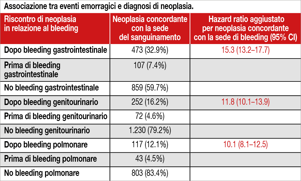 La popolazione inclusa nell’analisi è composta da 119.480 pazienti di eta ≥66 in fibrillazione atriale (osservati tra il gennaio 2008 e il gennaio 2022) nei quali era stata iniziata una terapia anticoagulante, escludendo coloro che avessero una storia di neoplasia o di bleeding oppure fossero in dialisi o avessero una malattia La popolazione inclusa nell’analisi è composta da 119.480 pazienti di eta ≥66 in fibrillazione atriale (osservati tra il gennaio 2008 e il gennaio 2022) nei quali era stata iniziata una terapia anticoagulante, escludendo coloro che avessero una storia di neoplasia o di bleeding oppure fossero in dialisi o avessero una malattia valvolare. L’età media risultava di 77 anni, il 52% erano maschi, il 69% era in anticoagulante orale diretto e il 31% in warfarin. Il bleeding nei 2 anni successivi all’inclusione nello studio veniva certificato in base a ricovero ospedaliero, visita al Pronto Soccorso o prescrizione medica ed era osservato nel 21.8% dei pazienti, a una mediana di 266 giorni dall’inizio dell’anticoagulazione. Nei 2 anni successivi all’inizio dell’anticoagulazione, sono state diagnosticate neoplasie in 5.800 pazienti (4.9%), di cui 2.000 (34.5%) diagnosticate dopo un episodio di bleeding. Le neoplasie più comuni erano le colorettali (n = 431), polmonari (n=344) e prostatiche (N = 256). Usando modelli di regressione, il bleeding era associato con il rischio di avere una neoplasia (hazard ratio [HR], 4.0 [95% CI, 3.8–4.3; P<0.001). I vari HR per le neoplasie gastrointestinali, genitourinarie e polmonari diagnosticate concordanti per sede di sanguinamento erano più elevati ed espressi nella Tabella. Dei 5.800 pazienti in cui è stata diagnosticata una neoplasia, la stadiazione era disponibile in 3.026: escludendo il tumore della mammella (non associato a bleeding) uno stadio 4 era osservato nel 28.0% di coloro che avevano avuto bleeding versus 34.0% di quelli senza precedente bleeding (P<0.001). Tra gli 8.612 pazienti con bleeding gastrointestinale, un accertamento endoscopico ha avuto luogo nel 24.6% dopo l’episodio di bleeding, mentre il 9.8% l’ha ricevuto prima della complicanza emorragica valvolare. L’età media risultava di 77 anni, il 52% erano maschi, il 69% era in anticoagulante orale diretto e il 31% in warfarin. Il bleeding nei 2 anni successivi all’inclusione nello studio veniva certificato in base a ricovero ospedaliero, visita al Pronto Soccorso o prescrizione medica ed era osservato nel 21.8% dei pazienti, a una mediana di 266 giorni dall’inizio dell’anticoagulazione. Nei 2 anni successivi all’inizio dell’anticoagulazione, sono state diagnosticate neoplasie in 5.800 pazienti (4.9%), di cui 2.000 (34.5%) diagnosticate dopo un episodio di bleeding. Le neoplasie più comuni erano le colorettali (n = 431), polmonari (n=344) e prostatiche (N = 256). Usando modelli di regressione, il bleeding era associato con il rischio di avere una neoplasia (hazard ratio [HR], 4.0 [95% CI, 3.8–4.3; P<0.001). I vari HR per le neoplasie gastrointestinali, genitourinarie e polmonari diagnosticate concordanti per sede di sanguinamento erano più elevati ed espressi nella Tabella. Dei 5.800 pazienti in cui è stata diagnosticata una neoplasia, la stadiazione era disponibile in 3.026: escludendo il tumore della mammella (non associato a bleeding) uno stadio 4 era osservato nel 28.0% di coloro che avevano avuto bleeding versus 34.0% di quelli senza precedente bleeding (P<0.001). Tra gli 8.612 pazienti con bleeding gastrointestinale, un accertamento endoscopico ha avuto luogo nel 24.6% dopo l’episodio di bleeding, mentre il 9.8% l’ha ricevuto prima della complicanza emorragica.