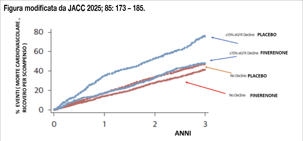 Nello studio FINEARTS-HF una iniziale riduzione di GFR ≥15% è stata più frequente nei pazienti in finerenone rispetto a quelli che assumevano placebo e si è associata a una maggior frequenza di eventi (morte cardiovascolare, ricoveri per scompenso) nel follow-up. Tuttavia tale associazione è risultata più marcata nel gruppo placebo che in quello trattato con finerenone. Un decremento iniziale di GFR non deve perciò portare a una sospensione del farmaco.