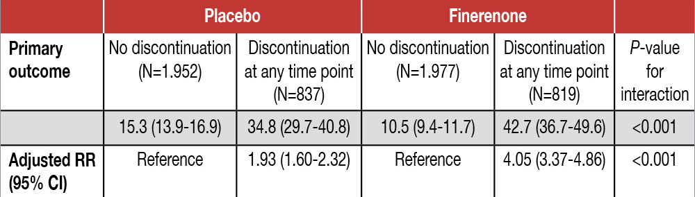 Nei 5.587 pazienti arruolati nello studio FINEARTSHF, in cui la GFR è stata misurata in basale e a 1 mese, 1.018 (18.2%) hanno avuto una riduzione ≥15% di questo parametro. Tale riduzione è stata osservata nel 23% dei randomizzati a finerenone e nel 13.4% di quelli randomizzati a placebo (OR: 1.95; 95% CI: 1.69-2.24; P<0.001). I pazienti con declino della funzione renale, rispetto a quelli con funzione conservata, erano più anziani (età media 72.9 vs 71.7, P<.001), maggiormente in classe NYHA III o IV (34.4 versus 29.8%, P<.001), con un più alto rapporto albumina/creatinina (23 vs 17 g/mg, P<0.001) e un valore mediano più elevato di NT-proBNP (1.185 vs 997 pg/mL P<0.001). Globalmente, una riduzione di GFR ≥15% si associava a un maggior rischio di eventi inclusi nell’outcome primario (Risk Ratio, RR: 1.26; 95% CI: 1.07-1.49; P=0.01). Tuttavia, gli eventi risultavano più frequenti rispetto ai pazienti senza aumento di GFR, solo nei pazienti in placebo (RR: 1.56; 95% CI: 1.22-1.99; P<0.01), mentre la differenza non era significativa nei pazienti randomizzati a finerenone (RR: 1.14; 95% CI: 0.90-1.43; P=0.27, vedi Figura). Dopo aggiustamento per le variabili confondenti, un declino di GFR ≥15% si associava a un rischio più elevato di outcome primario nei pazienti in placebo che in quelli che assumevano finerenone (P=0.04). Nella landmark analysis che ha verificato gli eventi dopo il primo mese sino al termine del follow-up, l’efficacia di finerenone si è parimenti manifestata sia nei pazienti con iniziale declino della funzione renale che in quelli senza riduzione di GFR (P for interaction 0.50). Si è manifestata una iperkaliemia (K >5.5 mmol/L) nel 12.5% dei pazienti senza riduzione della GFR in finerenone (vs 6.5% dei pazienti in placebo) e nel 21.4% dei pazienti con declino di almeno il 15% della GFR (vs il 10.2% dei pazienti in placebo).
