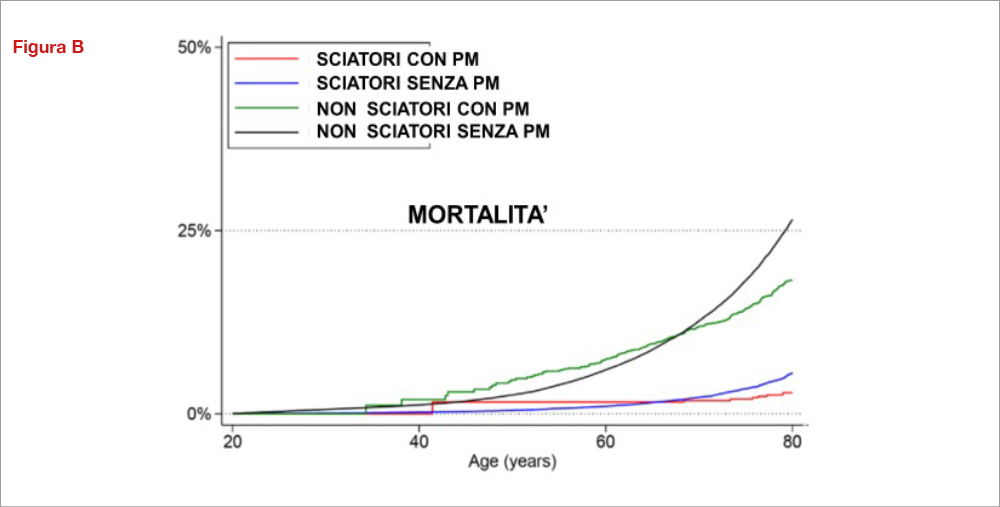 Lo studio ha considerato 209.108 sciatori svedesi che, tra il 1989 ed il 2011, abbiano partecipato e completato, nella loro vita, almeno 1 volta la famosa Vasaloppet, una gara di sci da fondo che si svolge annualmente, la prima domenica di marzo, su un percorso di 90 Km. I dati di follow-up in questi sciatori, riguardanti l’incidenza di impianto di pacemaker e la mortalità, sono stati confrontati con quelli di 532.290 non-sciatori, utilizzando il Swedish National Patient Register. Gli sciatori hanno mostrato una maggior incidenza di bradicardia [aHR aggiustato per diabete, scompenso, cardiopatia ischemica, fibrillazione atriale], 1.19 [95% CI, 1.05–1.34]) e di impianto di pacemakers (aHR, 1.17 [95% CI, 1.04–1.31]) rispetto ai non-sciatori: tale associazione riguardava solo gli sciatori di sesso maschile (circa il 60% della casistica) mentre nelle donne (circa il 40%) non era presente. L’indicazione a pacemaker era prevalentemente una “sick sinus syndrome” negli sciatori ed un BAV di terzo grado nei non-sciatori. L’incidenza di impianto di pacemaker era maggiore negli sciatori con migliori performance durante la Vasaloppet (cioè compiuta più velocemente) mentre era minore negli sciatori più lenti e nei non-sciatori (Figura, pannello A). Gli sciatori avevano una mortalità ridotta rispetto ai non-sciatori (aHR, 0.16 [95% CI, 0.15–0.17]) indipendentemente dalla necessità di un impianto di pacemaker (Figura, pannello B). Nelle sciatrici non si riscontravano tutte queste differenze osservate negli sciatori.Non vi sono apparenti motivi per queste discrepanze osservate tra i due sessi: gli autori ipotizzano che possano sussistere differenze nel regime di training tra sciatori e sciatrici, in termini di carico e di intensità di lavoro. In conclusione, lo studio mostra che gli sciatori fondisti, soprattutto quelli con le maggiori prestazioni, hanno una maggiore incidenza di bradicardia con necessità di impianto di pacemaker nel loro futuro; tale necessità non comporta tuttavia una minore attesa di vita.
