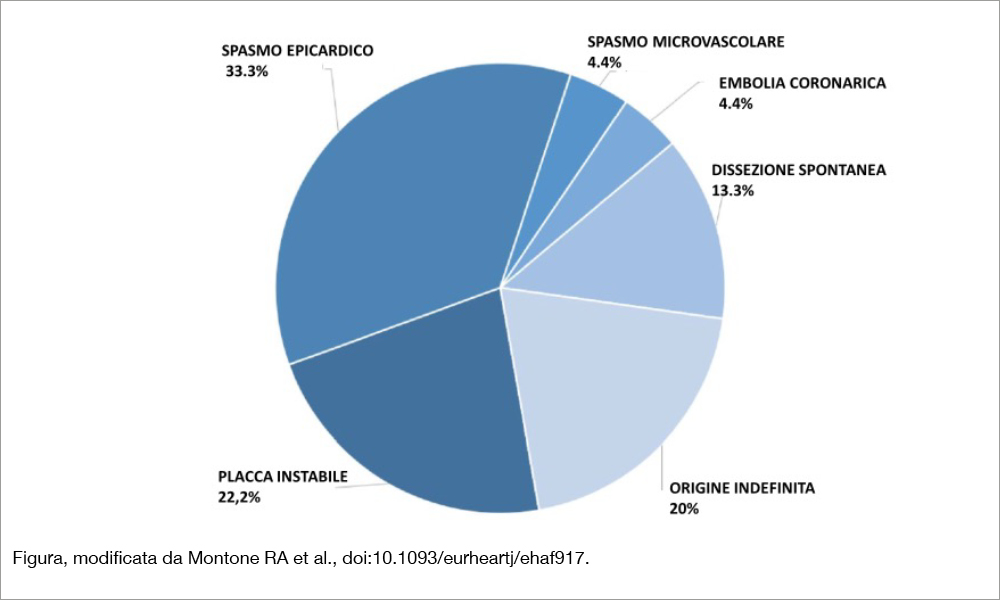 Lo studio PROMISE randomizzato, multicentrico (4 centri italiani) ha arruolato 92 pazienti con diagnosi confermata di MINOCA in base alla IV definizione di MI[3]Thygesen K, Alpert JS, Jaffe AS, Chaitman BR, Bax JJ, Morrow DA, et al. Fourth universal definition of myocardial infarction. Eur Heart J 2019;40:237–69. https://doi.org/ 10.1093/eurheartj/ehy462 e sottoposti a coronarografia, escludendo pazienti con insufficienza renale avanzata, sindrome di Takotsubo, dissezione coronarica di tipo 1 già evidente alla coronarografia. L’età media era di 62 ± 13 anni, il 48% era rappresentato da donne, il 18% da diabetici. Essi sono stati randomizzati a un trattamento stratificato in base alla patogenesi (n= 45) che includeva lo studio OCT nel caso che l’angiografia coronarica potesse suggerire un meccanismo di instabilità di placca (43 pazienti), test all’acetilcolina (eseguito in 38 pazienti per individuare uno spasmo epicardico o microvascolare), eco transesofageo (se si sospettava un’origine embolica, a esempio per la presenza di fibrillazione atriale, eseguito in 3 pazienti) risonanza magnetica (eseguita in 36 pazienti). La patogenesi risultante in base ai diversi accertamenti è esplicitata nella Figura. Il gruppo di controllo era composto da 47 pazienti sottoposti a una strategia e a una terapia standard. La numerosità dello studio era ipotizzata sulla base di un endpoint primario basato su una differenza di 9 punti nel cambiamento del punteggio sulla qualità di vita (in base al Seattle Angina Questionnaire-SAQSS) inizialmente stimata a 140 pazienti (70 per gruppo). L’arruolamento dello studio è stato rallentato dal Covid-19 e terminato dopo che una analisi a interim, eseguita nei 92 pazienti randomizzati, mostrava il raggiungimento dell’endpoint prefissato e una diminuzione non significativa degli eventi clinici nel follow-up a vantaggio della strategia di trattamento personalizzato. L’endpoint primario a 12 mesi mostrava una SAQSS significativamente più elevata nel gruppo col trattamento stratificato che nel gruppo standard (differenza di +9.38, 95% CI 6.81-11.95; P<.001). I MACE sono risultati più elevati nel gruppo a trattamento standard (8.5% versus 2.2%), una differenza tuttavia non statisticamente significativa.