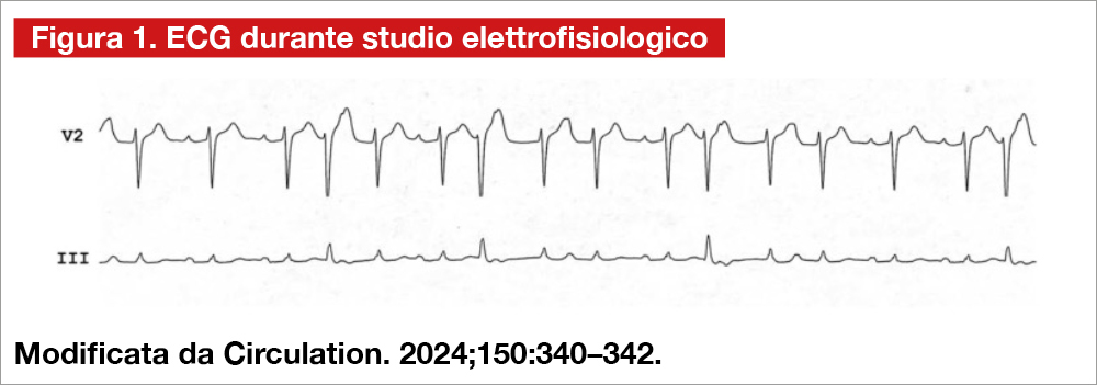 Un paziente di 60 anni lamenta episodi di cardiopalmo, durante i quali il suo smart watch invia segnali di possibile insorgenza di fibrillazione atriale. Poichè un monitoraggio Holter registra episodi analoghi, interpretati come parossismi di fibrillazione atriale, il paziente viene sottoposto a studio elettrofisiologico durante il quale viene registrato l’elettrocardiogramma, riportato in Figura 1.
