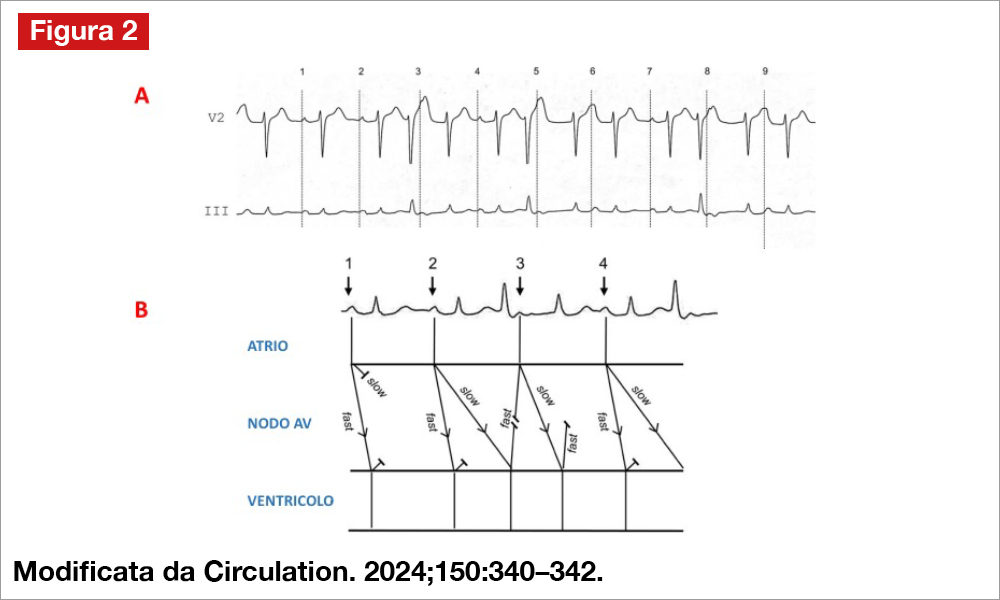 Trattasi di una tachicardia “double fire” non da rientro nodale, una aritmia rara che può essere interpretata erroneamente come extrasistolia sopraventricolare o ventricolare o come fibrillazione atriale[1]Wang NC. Dual atrioventricular nodal nonreentrant tachycardia: a systematic review. Pacing Clin Electrophysiol.2011;34:1671–1681. doi:10.1111/j.1540-8159.2011.03218.. L’ECG mostra una conduzione di un singolo impulso atriale in senso anterogrado sia lungo la via nodale a conduzione veloce e a conduzione lenta, generando due complessi, come mostra la Figura 2.