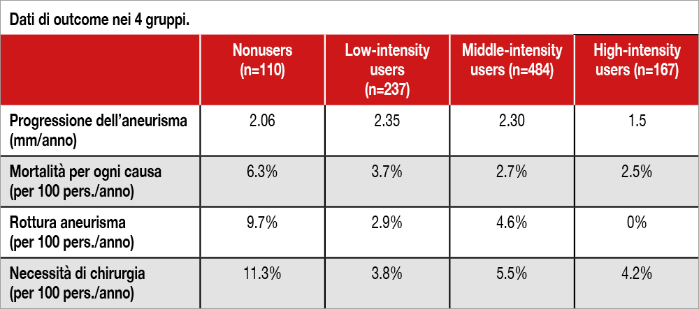 L’analisi ha incluso 998 pazienti maschi nei quali era stata documentata la presenza di AAA di dimensioni tra 30 e 55 mm in due studi di screening di popolazione (il Viborg Vascular Screening trial -VIVA-, condotto tra il 2008 ed il 2011e il Danish Cardiovascular Screening – DANCAVAS- trial, condotto tra il 2014 ed il 2018) i cui dati di terapia associata e successivo follow-up sono stati ottenuti dai registri sanitari danesi. L’età mediana era di 69.5 anni, il diametro mediano dell’AAA 35.4 mm. È stata determinata la presenza di terapia statinica e quantificata sulla base delle prescrizioni ottenute dai registri e della dose giornaliera utilizzata (DDD, la dose tipica giornaliera per un farmaco secondo la definizione OMS): in tal modo 110 pazienti (11%) sono stati considerati “non-users”, 237 (23.8%) “low-intensity users”, 484 (48.5%) “medium-intensity users” e 167 (16.7%) “high-intensity users”. Il diametro iniziale dell’AAA era 37.7mm (non-users) 34.7 mm (low-intensity users), 35.1 mm (mediumintensity users), 37.1 mm (high-intensity users) nei 4 gruppi rispettivamente. I pazienti “highintensity users” avevano un maggior numero di comorbilità, inclusa ipertensione, precedente infarto rispetto ai “low-intensity users”. La mediana di follow-up è stata globalmente di 4.97 anni, ma inferiore per i “non users” (2.97 anni) rispetto agli altri gruppi di pazienti. L’outcome primario era rappresentato dalla progressione di AAA, valutata utilizzando la regressione lineare basata su tutte le misurazioni di diametro ottenute, riducendo così l’impatto della variabilità del timing di rilevamento. Le variazioni del diametro sono risultate inferiori per il gruppo “high-intensity users” rispetto agli altri gruppi (vedi Tabella). All’analisi di regressione lineare un aumento di 1 DDD di statina si associava ad una variazione aggiustata di −0.22 mm/anno; da notare l’ampia variazione (-1.07 mm, P=0.02) nei pazienti che assumevano metformina rispetto a quelli che non l’assumevano. L’hazard ratio (HR) aggiustato a 5 anni per il rischio di chirurgia di riparazione, mortalità e rottura dell’AAA era significativamente inferiore per dosi di statina => 2 DDD (HR 0.82 ([95% CI, 0.70–0.97]; P=0.023).