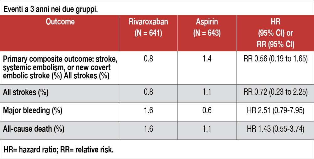 Lo studio è stato intrapreso dall’Ottawa Heart Institute in collaborazione con 56 centri di 6 Paesi in 1.284 pazienti sottoposti con successo, almeno 1 anno prima, ad ablazione della fibrillazione atriale (AF). L’età media era 66 anni, più di 1 ablazione era stata eseguita nel 25% dei casi e AF era parossistica in due terzi dei pazienti. Il CHA2DS2VASc score medio era 2.2±1.1, con valori ≥3 nel 32% dei casi. Tutti i pazienti hanno effettuato una indagine di risonanza magnetica (MRI) cerebrale in basale e a 3 anni per individuare stroke embolici silenti (con dimensione di ≥15 mm alla MRI). I criteri di esclusione erano rappresentati da età >85 anni e clearance della creatinina <30 ml/ min, così come erano esclusi i pazienti portatori di valvola meccanica. I pazienti sono stati randomizzati in due gruppi: 641 hanno assunto rivaroxaban 15 mg, mentre 643 hanno assunto ASA (dosaggio variabile tra 80 e 120 mg). Lo studio aveva un disegno di superiorità per rivaroxaban (40% di riduzione dell’endpoint primario, ipotizzando una incidenza annuale nel gruppo ASA di 3.5% di stroke, sia manifesto che silente). L’endpoint primario di efficacia (stroke ischemico incluso quello silente ed embolismo arterioso) è stato raggiunto nello 0.31% per anno nel gruppo rivaroxaban e nello 0.66% per anno nel gruppo ASA (rischio relativo 0.56; 95% CI, 0.19-1.65; P= 0.28). Si sono verificati nuovi infarti cerebrali di ampiezza < 15 mm nel 3.9% del gruppo rivaroxaban e nel 4.4% del gruppo ASA (rischio relativo, 0.89; 95% CI, 0.51-1.55). L’endpoint primario di sicurezza (bleeding fatale e maggiore, secondo definizione ISTH) si è verificato nell’1.6% con rivaroxaban e nello 0.6% con ASA a 3 anni (hazard ratio, 2.51; 95% CI, 0.79 -7.95). Il bleeding minore è risultato invece significativamente più elevato nel gruppo rivaroxaban (HR 3.71,95% CI 2.29–6.01).