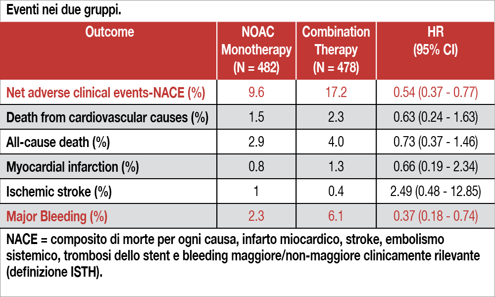 Lo studio, condotto in 32 centri sud-coreani, ha coinvolto 960 pazienti in terapia anticoagulante con DOAC per fibrillazione atriale (parossistica nel 39% e persistente/permanente nel 61%) con età media di 71 anni (i pazienti con età >85 anni erano esclusi) e sottoposti, nella loro storia clinica, a impianto di stent (di seconda o terza generazione) per sindrome coronarica acuta (65%) o coronaropatia stabile (35%) a una mediana di 32.8 mesi prima dell’inclusione nello studio. Le donne rappresentavano il 21% della casistica. Essi sono stati randomizzati a doppia terapia antitrombotica (DOAC + clopidogrel, n=478) o monoterapia (solo DOAC, n=482). Il DOAC utilizzato era apixaban nel 61% (5 mg x2 in entrambi i gruppi, con riduzione a 2,5 mg x2 secondo raccomandazione), rivaroxaban nel 34% (20 mg in monoterapia, 15 mg in duplice terapia antitrombotica) ed edoxaban nel 5% dei casi. Al momento della randomizzazione, il 61% era in duplice terapia antitrombotica, il 23% con il solo anticoagulante e il 16% con il solo antipiastrinico. Il CHA2DS2-VASc score mediano era = 4 e l’HAS BLED mediano = 3. Lo studio era disegnato come non-inferiorità della monoterapia versus la terapia combinata con un margine prestabilito del 3% per un endpoint di “Net Adverse Clinical Events” (NACE), composito di morte per ogni causa, infarto miocardico, stroke, embolismo sistemico, trombosi dello stent e bleeding maggiore/non-maggiore clinicamente rilevante (definizione ISTH). A 12 mesi, l’incidenza dell’endpoint primario (valutato con curve di Kaplan Meier) è stata del 9.6% nel gruppo assegnato alla monoterapia e del 17% nel gruppo di terapia combinata, con una differenza di 7.6 punti percentuali (CI al 95% compresi tra −11.9 e −3.3, P<0.001 per non-inferiorità) e un hazard ratio di 0.54 (95% CI, 0.37- 0.77; P<0.001 per superiorità). Il bleeding maggiore è occorso nel 5.2% dei pazienti in monoterapia e nel 13.2% di quelli in terapia di combinazione (hazard ratio, 0.38; 95% CI, 0.24-0.60). Gli endpoint secondari dello studio sono mostrati nella Tabella.