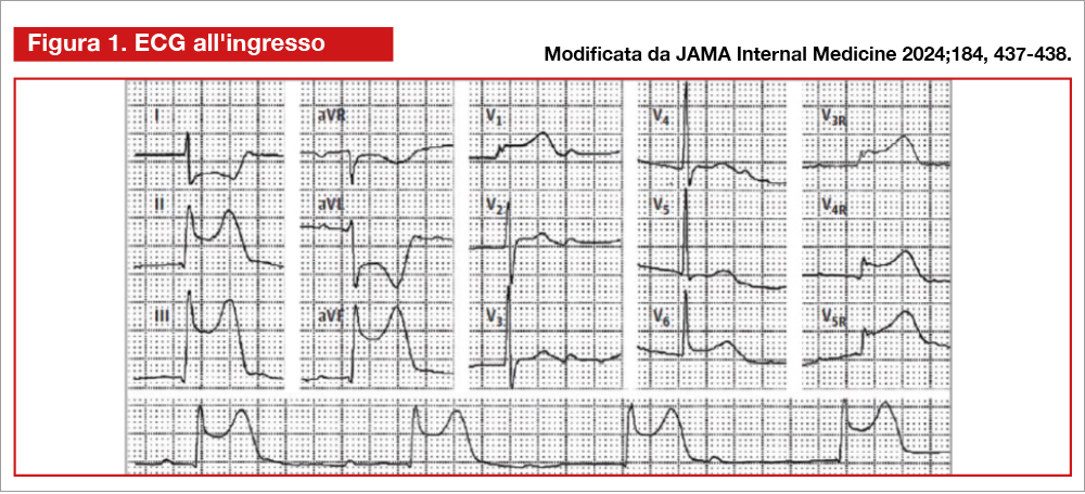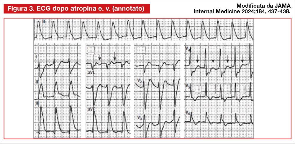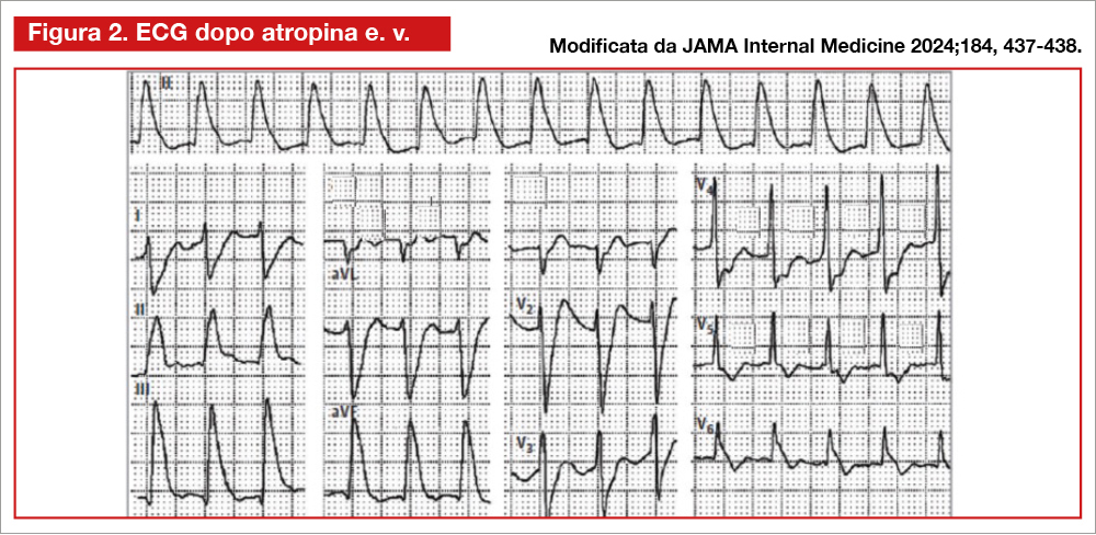 Un paziente sulla cinquantina si reca in Pronto Soccorso per un dolore toracico oppressivo. È ipoteso (80/60mmHg) e bradicardico (39 bpm). L’ECG mostra un infarto inferiore e del ventricolo destro con blocco atrioventricolare completo (Figura 1). Dopo la somministrazione di atropina il paziente avverte una sensazione di cardiopalmo che va accentuandosi. Viene eseguito un nuovo elettrocardiogramma (Figura 2).